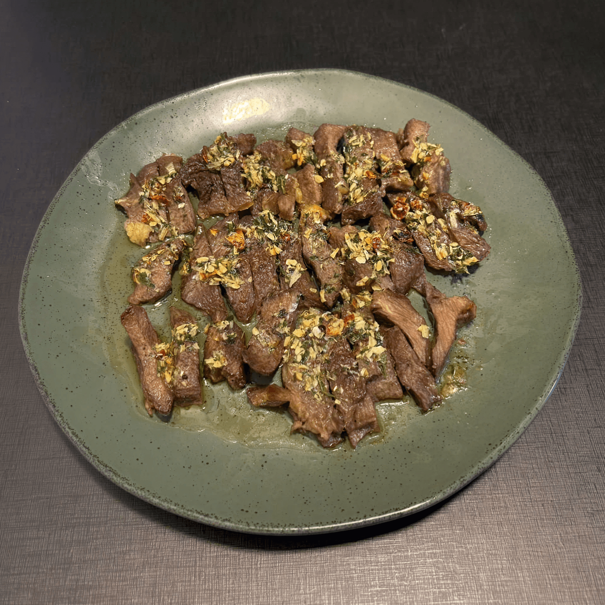 Contra filé grelhado e cortado em tiras. Acompanhado por Chimichurri Argentino.