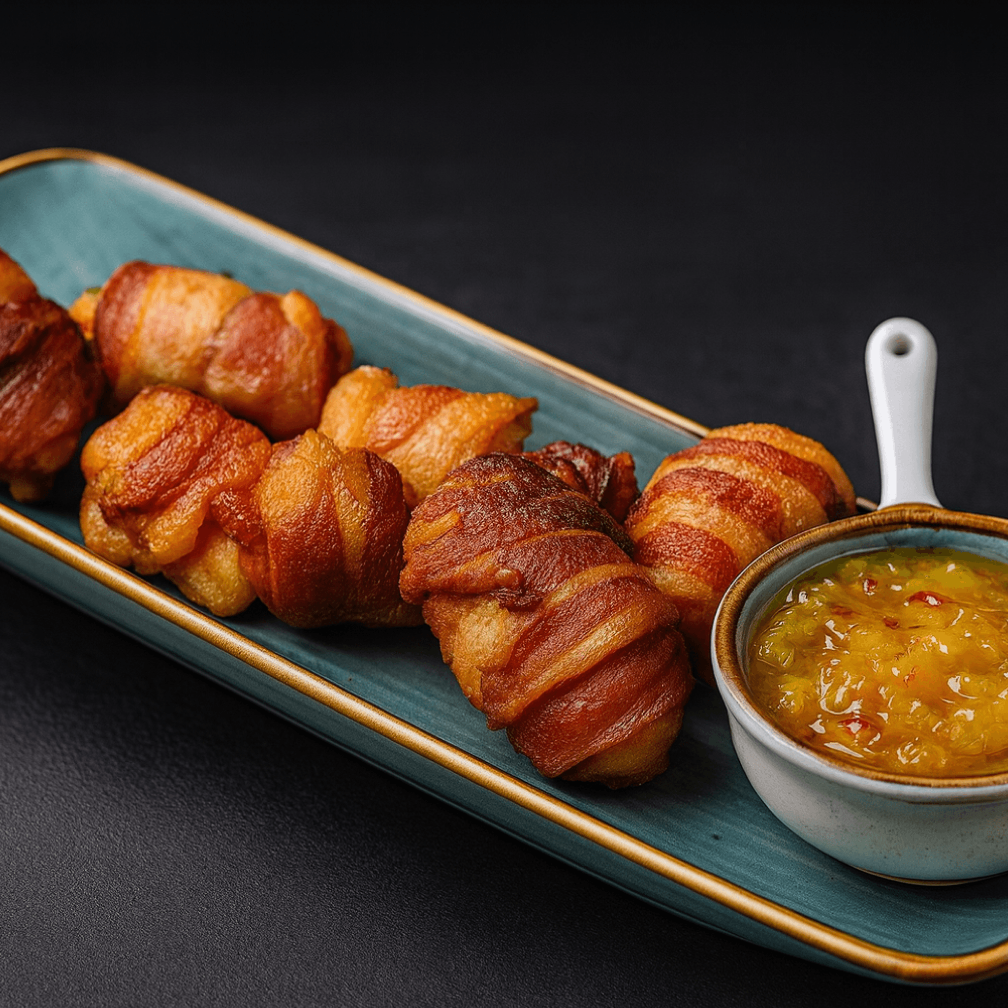 Filé de frango envolto em fatias de bacon. Acompanha chutney de manga.