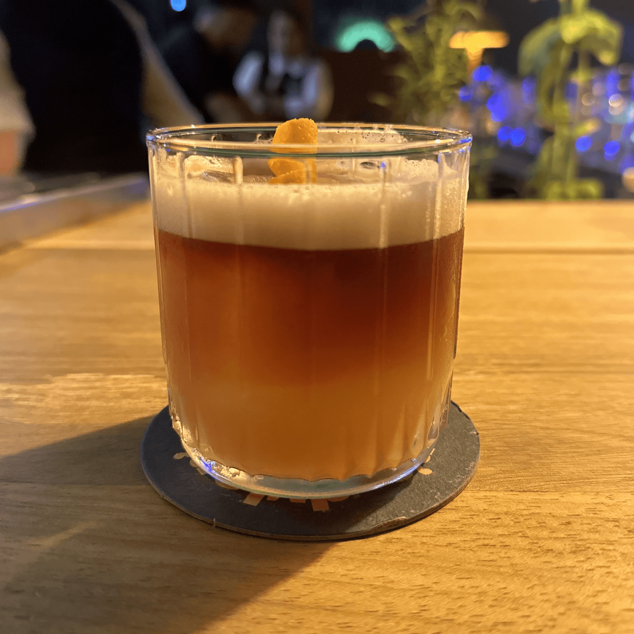 Whisky Bourbon, suco de limão, simple syrup, clara de ovo pasteurizada, angostura bitters e uma camada de vinho do porto.