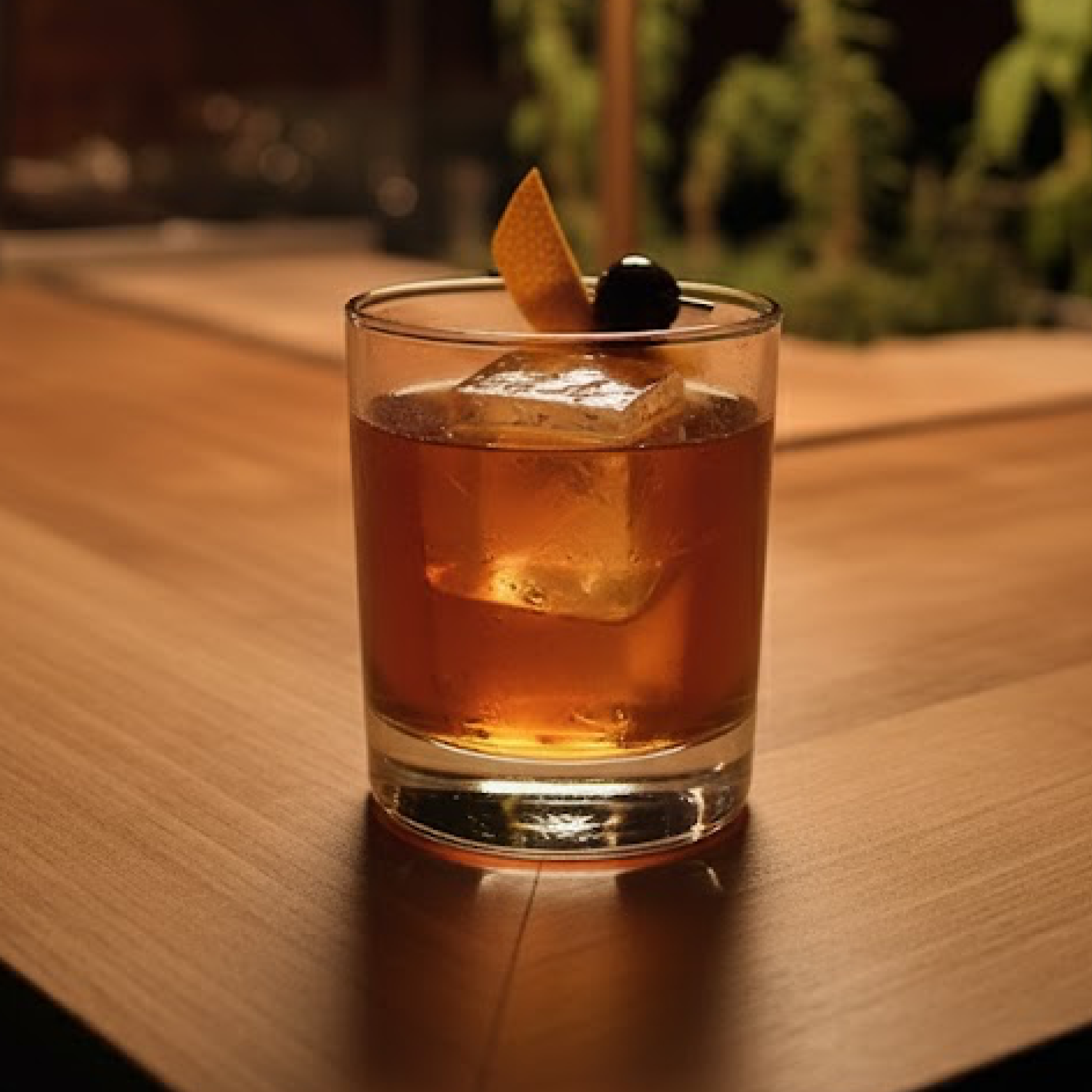 Whisky Bourbon, cubo de açúcar, água com gás e angostura bitters.
