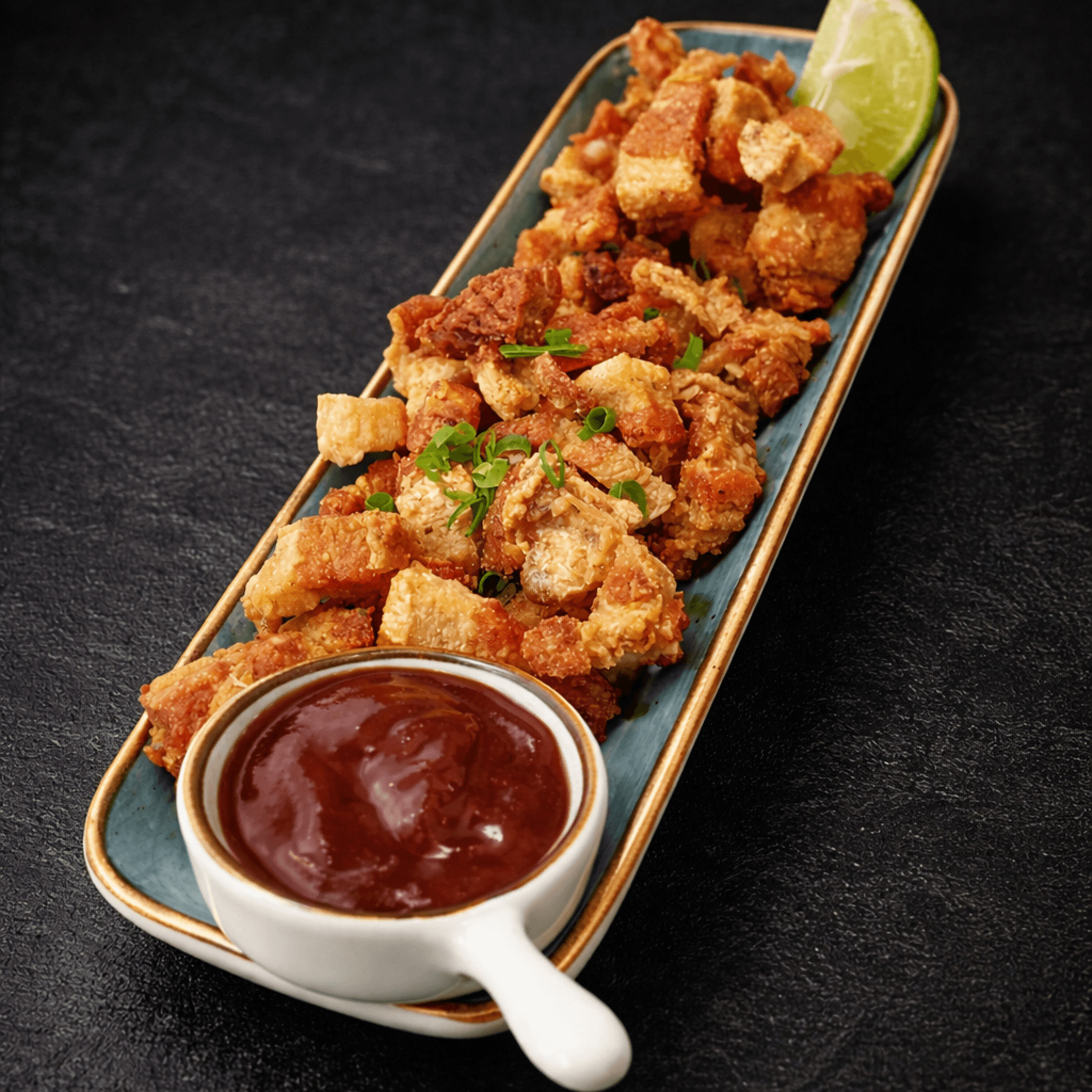 Panceta frita. Acompanha molho barbecue de goiabada.