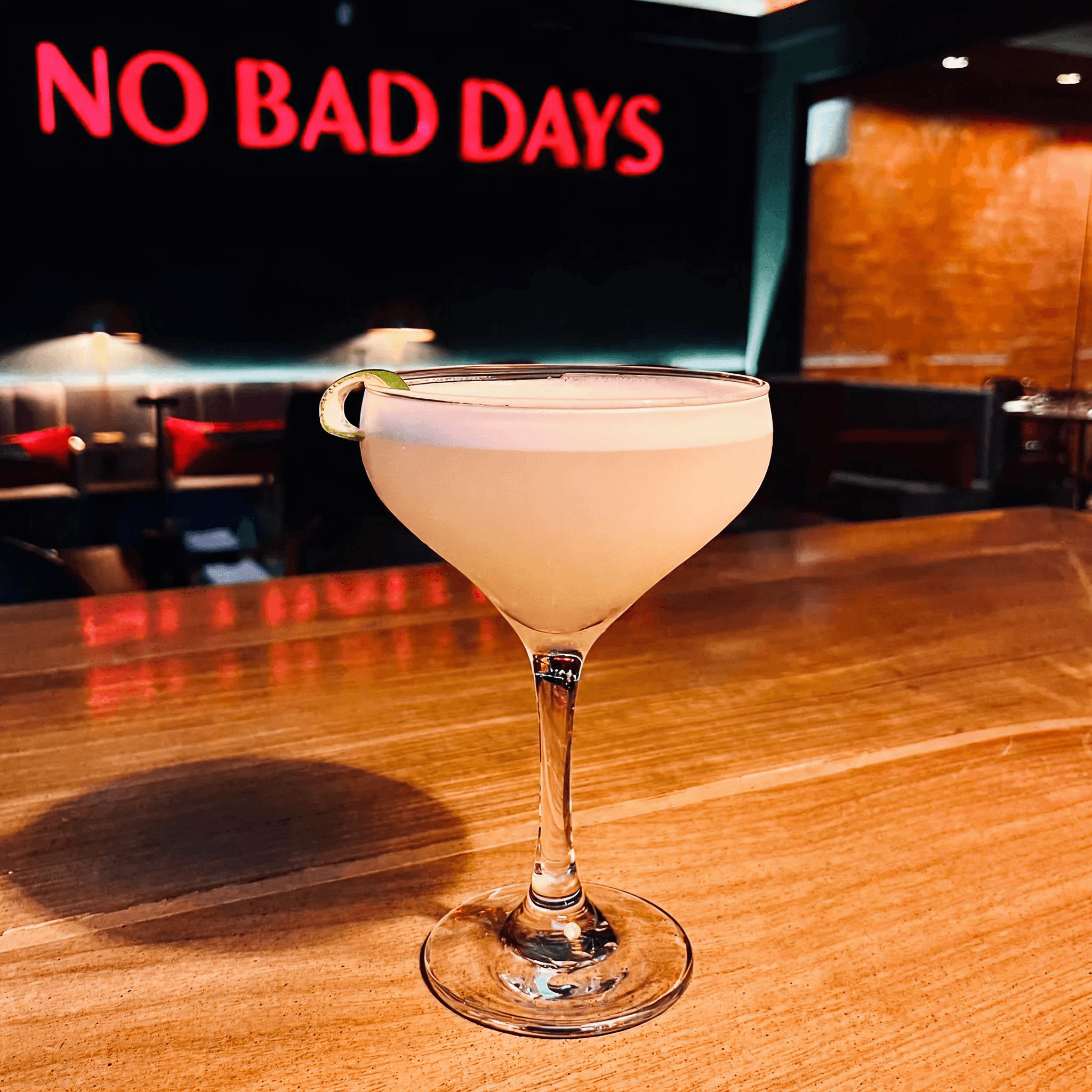 Gin Bulldog, Triple Sec, suco de limão, simple syrup e clara de ovo pasteurizada.